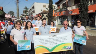 A Cooper A1 desfilou com seus colaboradores levando placas de todas as atividades econômicas e sociais desenvolvidas. Além disso, apresentou sua missão e os sete princípios universais e norteadores do cooperativismo.“Primeiramente, nos sentimos muito felizes pela escolha do tema, pois, cooperação é a essência de nossa instituição e fica evidente a importância que a sociedade e o poder público reservam para o tema”, afirma a gerente da unidade da Cooper A1 de Itapiranga, Elisiane Bomm Tavares. De acordo com ela, desfilar pela Cooper A1 foi motivo de muito orgulho, pois, trata-se de instituição cooperativa modelo, e que, junto com às cooperativas genuínas do Brasil, fazem a diferença na vida de milhares de brasileiros.