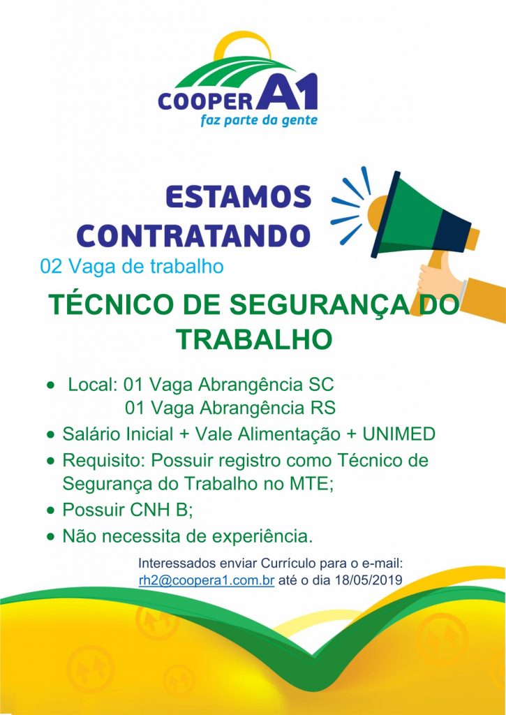 São duas vagas para técnico de segurança do trabalho, os interessados deverão cadastrar seus currículos pelo site da Cooper A1 através do link: http://www.coopera1.com.br/atendimento/trabalhe-conosco/, ou seguir as instruções abaixo: