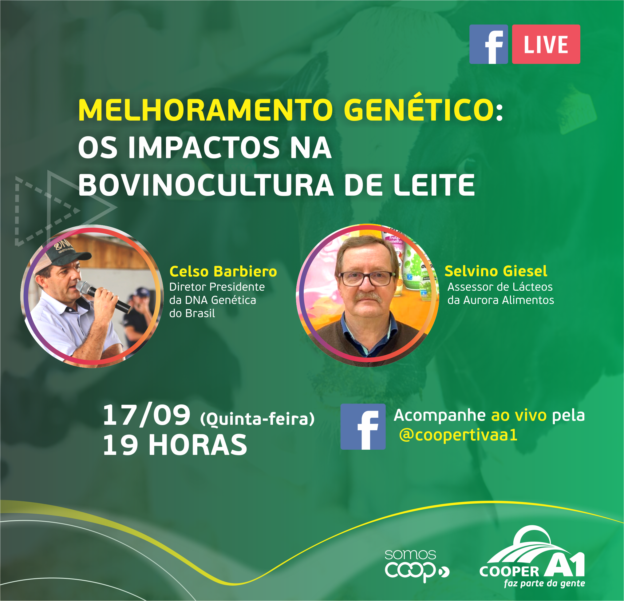 “Melhoramento genético: os impactos na bovinocultura de leite” é o tema da live que acontece nesta quinta-feira, 17/09, a partir das 19 horas, na página da Cooper A1 no Facebook.  A live será apresentada por Graziela Hoff Gloger, subgerente da atividade de leite na Cooper A1, Selvino Giesel, assessor de lácteos da Aurora Alimentos e Celso Barbiero, diretor presidente da DNA Genética do Brasil.
