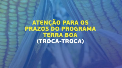 Atenção produtores rurais para a data de vencimento do programa Terra Boa (Troca-troca). A Cooper A1 informa aos produtores beneficiados com sementes de milho e de calcário, que o vencimento dos contratos, para ter direito ao bônus e descontos, vai até 26 de abril. Para mais informações os interessados podem entrar em contato com os setores administrativos e financeiros da unidade mais próxima.