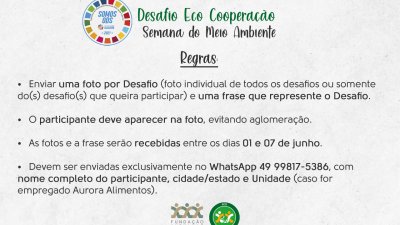 As categorias do Desafio Eco Cooperação incluem interno (empregados Aurora Alimentos) e externo (comunidade em geral). Serão premiadas, por categoria, as melhores fotografias de todos os desafios cumpridos; a imagem mais representativa/reflexiva de um desafio e a frase mais criativa que represente o desafio. A divulgação dos ganhadores será no dia 21 de junho nas mídias sociais da FALB (Instagram, Facebook e site). A FALB também entrará em contato com os ganhadores via telefone.