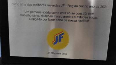 O reconhecimento foi simbolizado em uma placa entregue pelo representante da JF Máquinas ao gerente das lojas agropecuárias, Mário Grisotti e ao coordenador de máquinas e implementos da cooperativa, Gilberto Maihack. A placa tem os dizeres “Uma parceira sólida como esta, se constrói com trabalho sério, relações transparentes e atitudes éticas”.