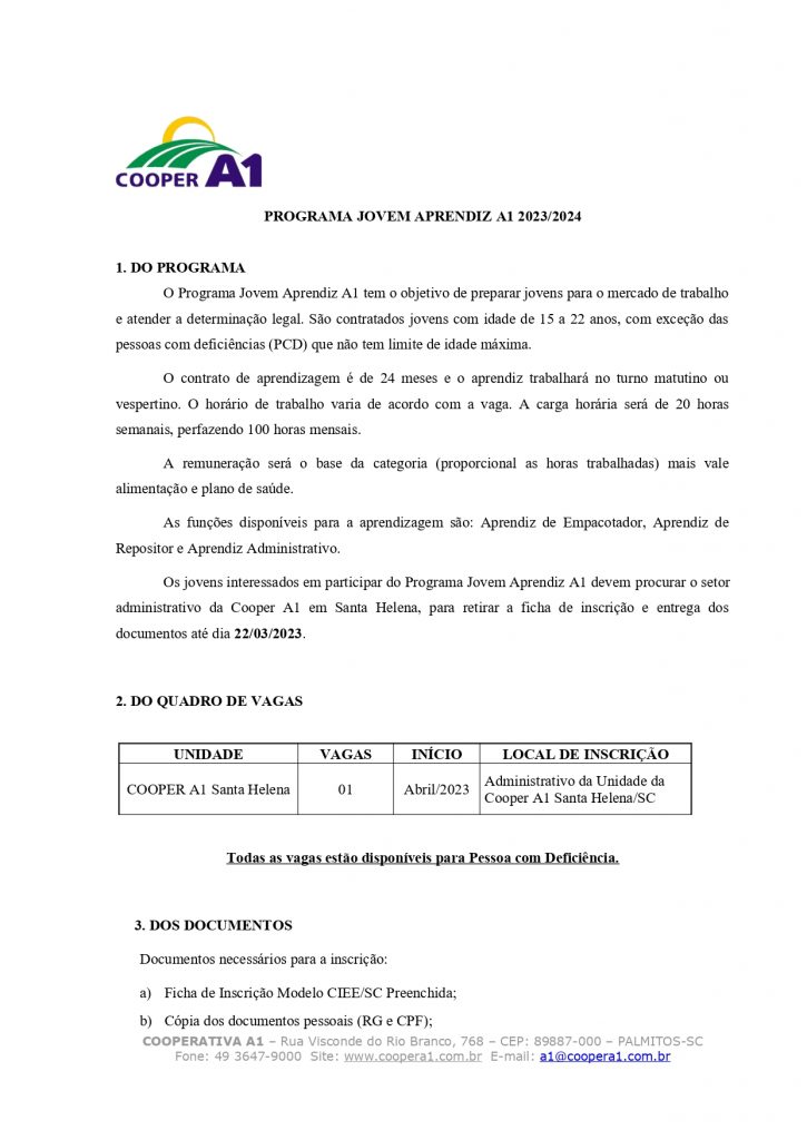 EDITAL: Jovem Aprendiz Santa Helena/SC
