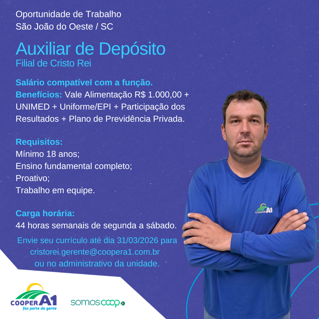 Descrição: Oportunidade para auxiliar de Depósito na unidade de Cristo Rei - São João do Oeste SC.
